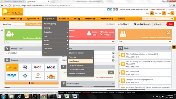 To get additional limit for client, Request needs to be punched in the below given path from Partner login of web site: